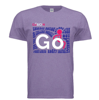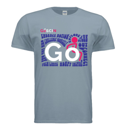 Available in Light Blue, Heather Purple, and Berry Pink, the GO GOSCIN T-Shirt is a bold, empowering statement piece designed with accessibility in mind. Featuring a dynamic “GO” design graphic surrounded by inspiring text, this shirt encourages wheelchair users and everyone to get out, get moving, and live life fully.